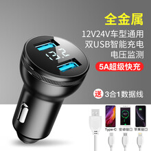 车载充电器手机快充点烟转换插头24v汽车内usb快速一拖二车充 【5A快充25W全金属黑】+送(苹果-安卓-TY