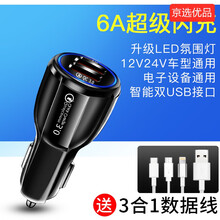 车载充电器手机快充点烟转换插头12v-24v汽车内通用品usb快速车充 升级款•6A闪充+LED氛围灯+3合1数据线